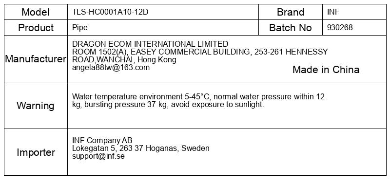 Temperatura vode v okolju 5–45 °C, normalen vodni tlak znotraj 12 kg, tlak razpoka 37 kg, izogibajte se izpostavljanju sončni svetlobi.