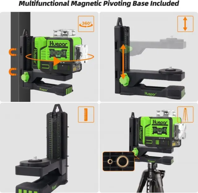 Ta laser z zelenimi linijami ponuja 1/4″-20 in 5/8″-11 montažne navoje za pritrditev na stojalo ali magnetni nosilec. Močan magnetni nosilec omogoča hitro pozicioniranje na kovinske površine, kar pomaga obesiti laserski nivo za stenske aplikacije in ga je mogoče zasukati do želenega kota. Magnetna podlaga ima tudi pritrdilne navoje 1/4″-20 in 5/8″-11, ki ustrezajo različnim navojem stativa.