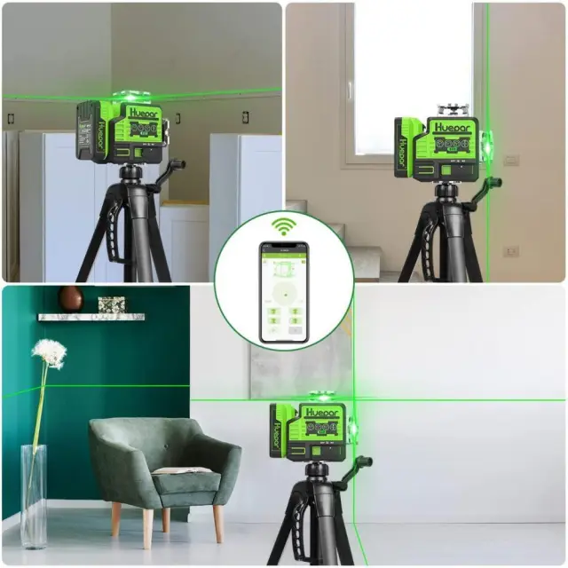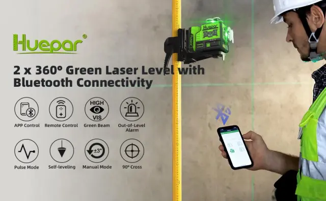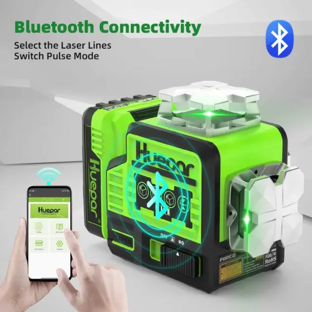Povezljivost Bluetooth omogoča nadzor nad nastavitvijo laserja iz cele sobe z aplikacijo Huepar na pametnem telefonu. Aplikacija in daljinski upravljalnik lahko vklopita/izklopita laserske linije in impulzni način, izberete laserske ravnine. Aplikacija Huepar ponuja tudi alarm za izven nivoja. Lasersko orodje lahko poveže dve napravi Bluetooth hkrati. Z nadzorom bluetooth vaše nalogo poravnave postane preprosto in hitro.