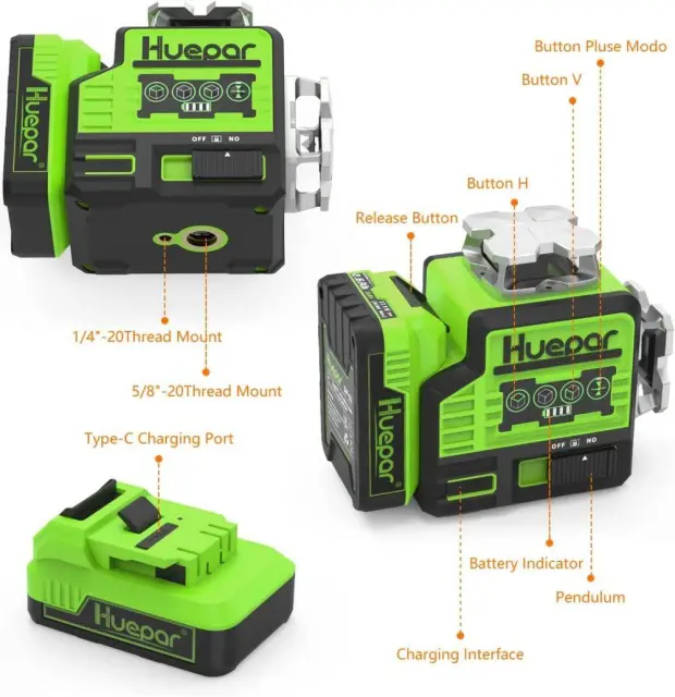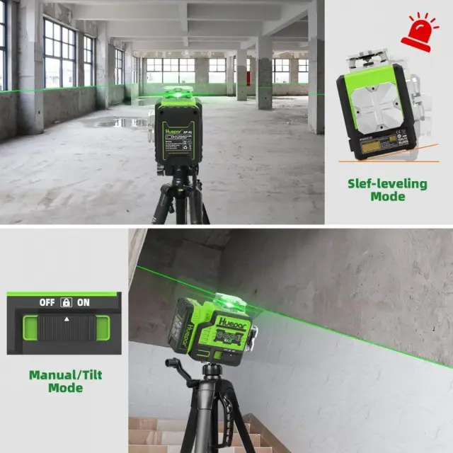 Huepar Nova generacija 8 linij zelenega laserskega samonivelirnega nivoja, idealnega za poravnavo, izravnavo in kvadriranje potreb pri gradnji.