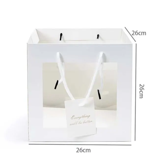 Vsestranska embalaža za darila: Te kvadratne vrečke za darila so idealne za različne priložnosti, vključno z rojstnimi dnevi, porokami, prazniki in poslovnimi dogodki. Njihova elegantna oblika in prosojno okno izboljšata predstavitev vsakega darila, zaradi česar so popolne za razstavljanje cvetja, gurmanskih dobrot ali ročno izdelanih predmetov. Ročaj zagotavlja enostavno prenašanje, medtem ko velikost 26x26x26 cm nudi dovolj prostora za različne velikosti daril. Te vrečke za darila ponujajo prefinjeno in praktično rešitev za vse vaše potrebe pri obdarovanju, s čimer povečujejo veselje ob darovanju in prejemanju.