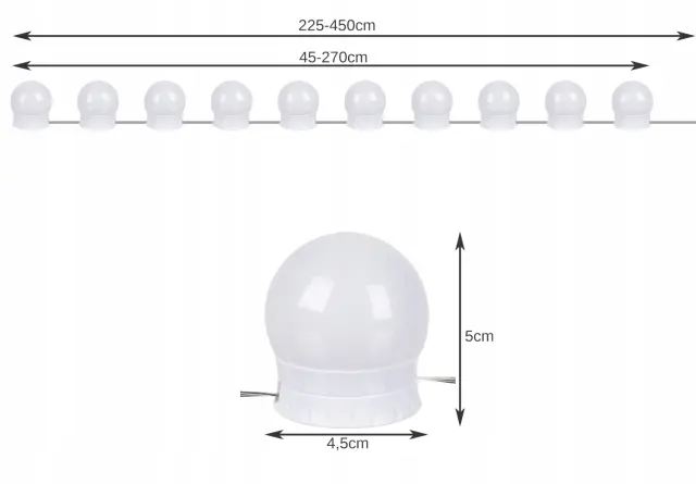 SPECIFIKACIJA: priročna nadzorna plošča: da, na kablu; možnost lepljenja na ogledalo: da; svetla barva: topla, nevtralna, hladna; material: plastika; odtenki svetlobe: 3; stopnje intenzivnosti: 11; skupno število načinov: 30; USB napajalnik; moč: 12W; napetost: 5V; skupna dolžina kabla: 4,5 m (vključno s kablom s svetilkami 2,7 m); nastavljiva dolžina kabla med svetilkami: do 25 cm; mere žarnice (širina / višina): 4,5 x 5 cm; teža: 0,15 kg; teža v paketu: 0,236 kg.