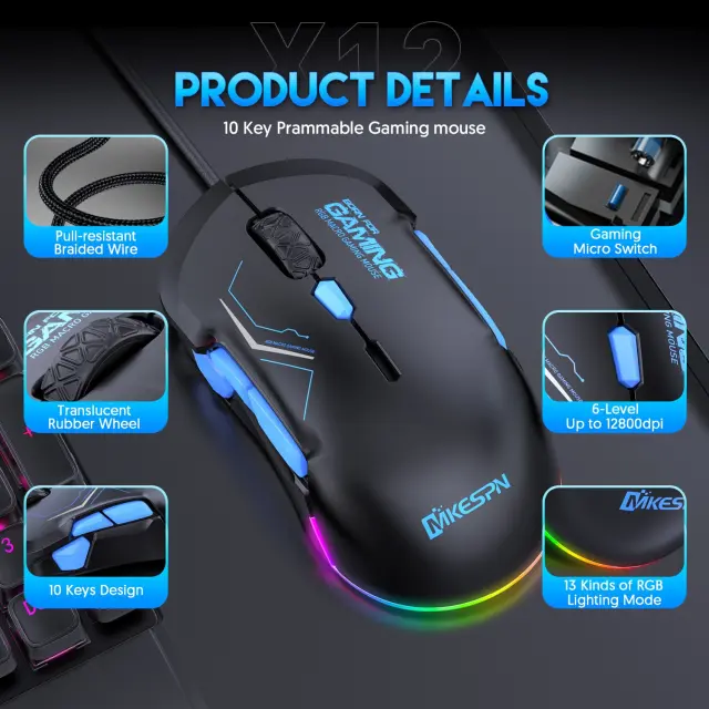 10-tipkovna RGB žična miška XSX-X12: 12800 DPI, 1000 Hz, 8 milijonov klikov Black+Blue