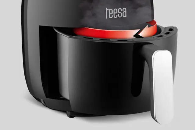 Se sprašujete, kako deluje cvrtnik brez maščobe? Skrivnost digitalnega zračnega cvrtnika Teesa je uporaba vročega zraka, ki zmanjša porabo olja na absolutni minimum. Zahvaljujoč pravilnemu kroženju zraka se naprava hitro segreje in toplota se enakomerno porazdeli.