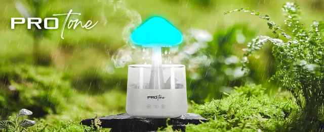 NAPREDNE FUNKCIJE VLAŽENJA – vlažilnik zraka ponuja tri načine dežja: brez dežja, rahel dež in močan dež , ki jih je mogoče enostavno nastaviti z gumbom s simboli kapljice . Poleg tega naprava omogoča nastavitev količine proizvedene pare s pritiskom na ta gumb za 3 sekunde, kar vam omogoča prilagajanje stopnje vlaženja individualnim potrebam uporabnika. Voda v napravi je v zaprtem krogu, kar zagotavlja neprekinjeno kroženje in učinkovito delovanje vlažilnika. Vlažilec ni le praktičen, ampak tudi tih, zaradi česar je idealen za uporabo ponoči, ne da bi motil vaš spanec. Zvok tako imenovanega dežja “Beli šum” je zvok na ravni 30-50 dB . Poleg tega lahko napravo uporabite za aromaterapijo, tako da v vodo dodate nekaj kapljic svojega najljubšega eteričnega olja, ki bo v prostor vneslo sproščujoč vonj.