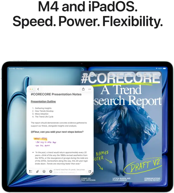 Novi iPad Air z zmogljivim čipom M4 prinaša izjemno hitrost, odzivnost in energetsko učinkovitost v tankem in lahkem ohišju. Napreden Liquid Retina zaslon zagotavlja ostro sliko in živahne barve, medtem ko podpora za Apple Pencil in Magic Keyboard omogoča brezhibno ustvarjanje, delo in zabavo. iPad Air M4 je odlična izbira za uporabnike, ki želijo profesionalno zmogljivost v vsestranski in prenosni napravi.
