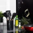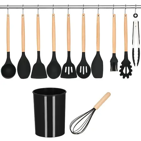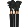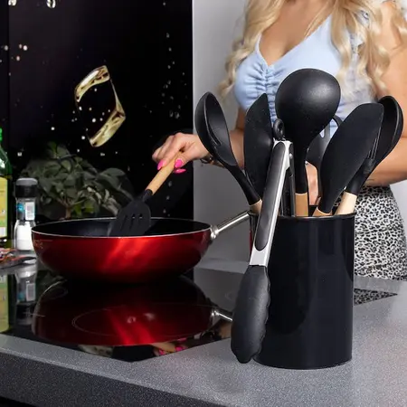 Silikonski kuhinjski dodatki so moderni in zelo funkcionalni. Komplet je sestavljen iz 12 črnih elementov, ki bodo poleg praktičnosti krasili vsak interier. Prednost kuhinjskih dodatkov iz silikona ni le estetika izdelave, ampak tudi udobje uporabe, saj so posode odporne na visoke in nizke temperature. Dovoljeno temperaturno območje je od -30 do 230 stopinj. Po drugi strani pa se bambusovi leseni ročaji ne segrevajo, zato nam ni treba skrbeti za opekline.
