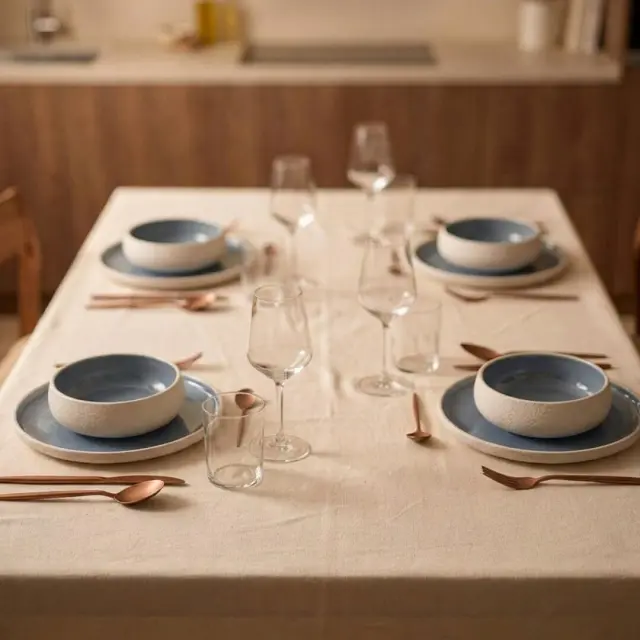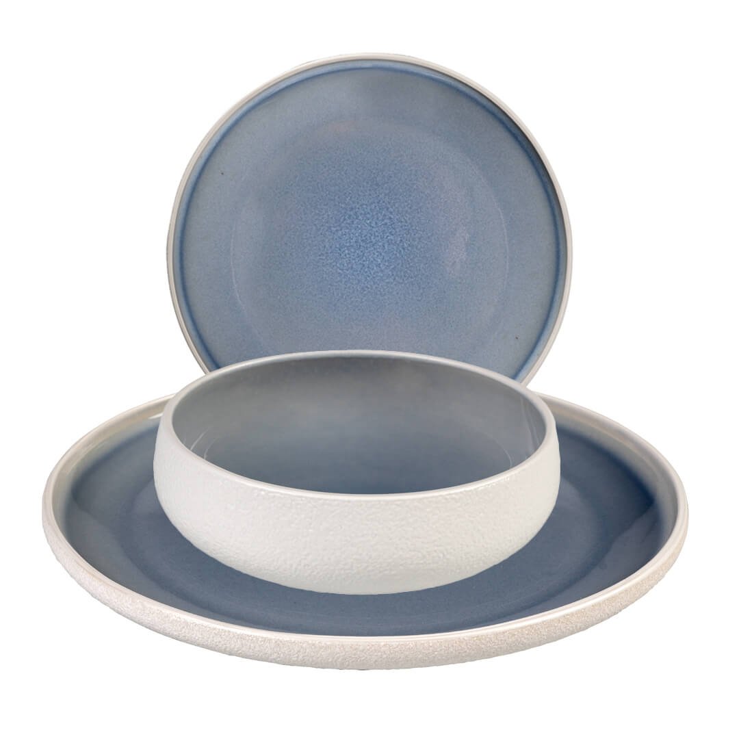 12-delni set krožnikov Stones združuje sodoben dizajn in funkcionalnost, zato je odlična izbira za vsakodnevno uporabo ali posebne priložnosti. Izdelan je iz kakovostne keramike Stoneware, ki zagotavlja trpežnost in dolgo življenjsko dobo. Zunanjost krožnikov navdušuje z grobo, belo matirano teksturo, ki ustvarja naraven in rustikalen videz, medtem ko notranjost krasi glazura v modri barvi. Ta kontrast daje setu poseben estetski pečat in se lepo poda različnim slogom pogrinjkov. Posebnost seta so globoki krožniki z eliptično oblikovanim robom, ki dodajo pridih unikatnosti ter omogočajo praktično serviranje jedi. Set je primeren za uporabo v mikrovalovni pečici in pomivanje v pomivalnem stroju. V kompletu so 4 plitvi krožniki premera 26,5 cm, 4 globoki krožniki premera 20 cm in 4 desertni krožniki premera 16 cm.
