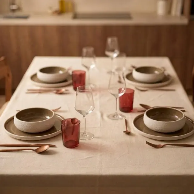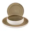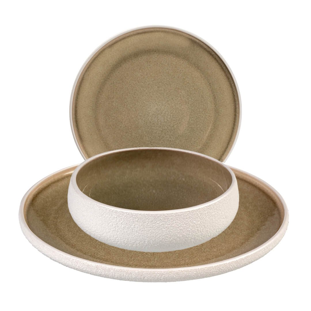 12-delni set krožnikov Stones združuje sodoben dizajn in funkcionalnost, zato je odlična izbira za vsakodnevno uporabo ali posebne priložnosti. Izdelan je iz kakovostne keramike Stoneware, ki zagotavlja trpežnost in dolgo življenjsko dobo. Zunanjost krožnikov navdušuje z grobo, belo matirano teksturo, ki ustvarja naraven in rustikalen videz, medtem ko notranjost krasi glazura v rjavi barvi. Ta kontrast daje setu poseben estetski pečat in se lepo poda različnim slogom pogrinjkov. Posebnost seta so globoki krožniki z eliptično oblikovanim robom, ki dodajo pridih unikatnosti ter omogočajo praktično serviranje jedi. Set je primeren za uporabo v mikrovalovni pečici in pomivanje v pomivalnem stroju. V kompletu so 4 plitvi krožniki premera 26,5 cm, 4 globoki krožniki premera 20 cm in 4 desertni krožniki premera 16 cm.