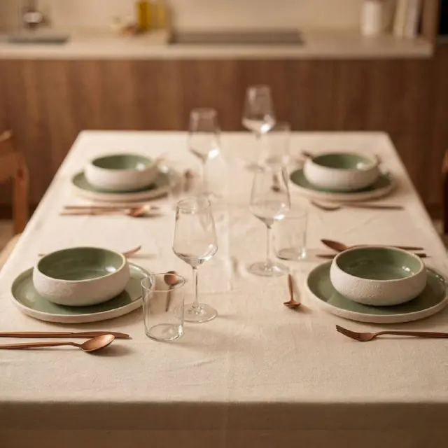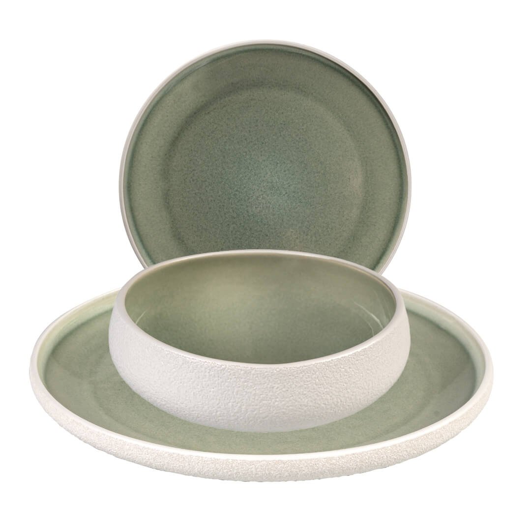 12-delni set krožnikov Stones združuje sodoben dizajn in funkcionalnost, zato je odlična izbira za vsakodnevno uporabo ali posebne priložnosti. Izdelan je iz kakovostne keramike Stoneware, ki zagotavlja trpežnost in dolgo življenjsko dobo. Zunanjost krožnikov navdušuje z grobo, belo matirano teksturo, ki ustvarja naraven in rustikalen videz, medtem ko notranjost krasi glazura v umirjeni zeleni barvi. Ta kontrast daje setu poseben estetski pečat in se lepo poda različnim slogom pogrinjkov. Posebnost seta so globoki krožniki z eliptično oblikovanim robom, ki dodajo pridih unikatnosti ter omogočajo praktično serviranje jedi. Set je primeren za uporabo v mikrovalovni pečici in pomivanje v pomivalnem stroju. V kompletu so 4 plitvi krožniki premera 26,5 cm, 4 globoki krožniki premera 20 cm in 4 desertni krožniki premera 16 cm.