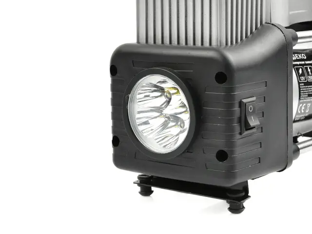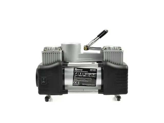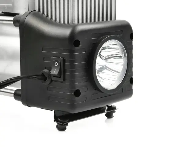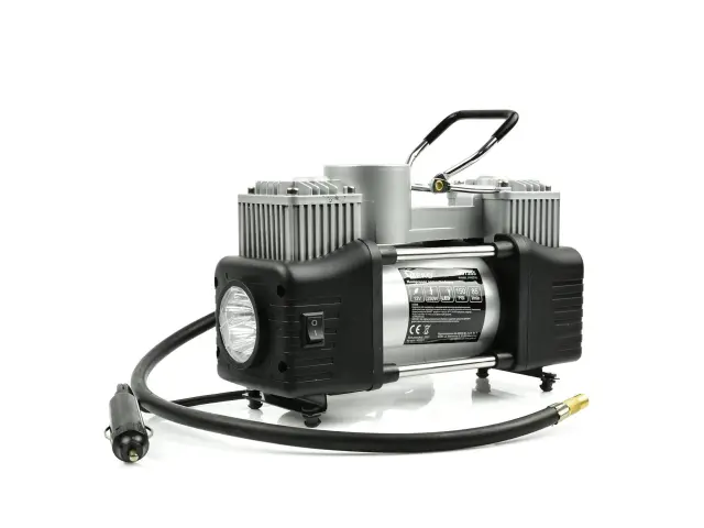 250W avtomobilski kompresor, ki se napaja z napetostjo 12-13,5V iz vtičnice za cigaretni vžigalnik ali neposredno iz baterije. Opremljen z berljivim jeklenim manometrom v 3 enotah: Bar, PSI in kg/cm2 . Ima navojno konico, prilagojeno avtomobilskim ventilom, ki se uporabljajo tudi pri motorjih in kolesih. Vgrajena svetilka vam omogoča udobno uporabo kompresorja ponoči, ne da bi potrebovali dodaten vir svetlobe. Dodatno komplet vsebuje pnevmatsko spiralno cev in komplet 3 šob za napihovanje kroglic, vzmetnic itd.
