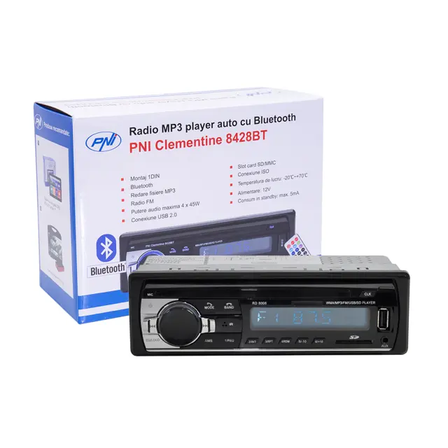PNI Clementine 8428BT ima barvni LCD zaslon, ki vam ponuja informacije o radijski frekvenci FM, vrsto in številko datoteke MP3 ter čas, ki je pretekel med predvajanjem datotek s kartice USB ali SD. Prav tako naprava uporablja novo tehnologijo ID3-Tag, ki prikazuje ime skladbe in mapo/mapo, kjer se nahaja.