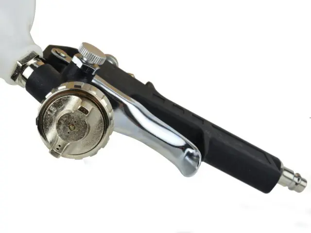 Pištola za razprševanje barve z delovnim tlakom 3 – 5 barov in porabo zraka 130 – 300 litrov na minuto omogoča profesionalno nanašanje barv in lakov. Razpršilna pištola uporablja zračni tlak, s čimer razprši barvo in s tem ustvari enakomeren premaz, medtem ko je njen rezervoar iz aluminija in ga je zato mogoče očistiti brez večjih naporov.