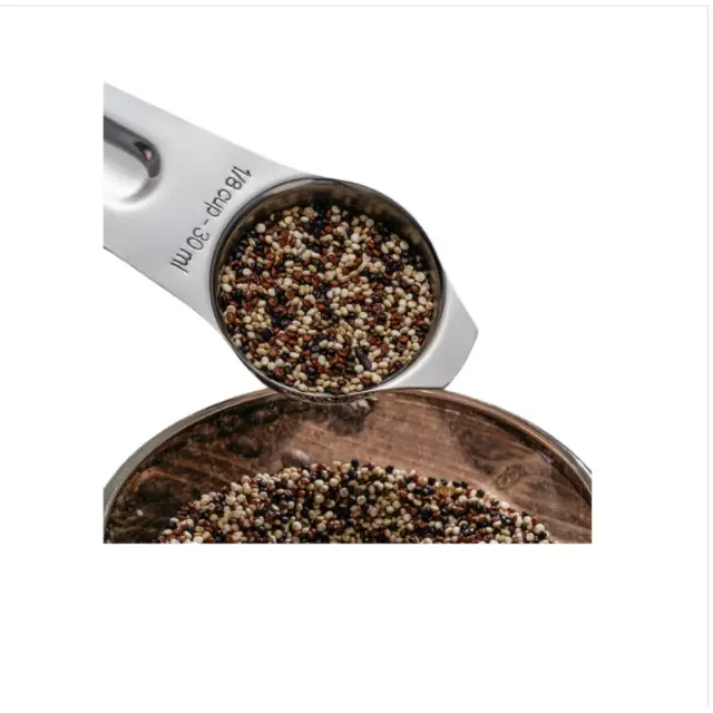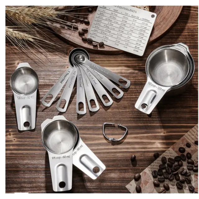 Celoten set za peko: Naš 14-delni merilni set vključuje 7 merilnih skodelic, 6 merilnih žlic in tabelo za pretvorbo mer. Skodelice segajo od 1/8 skodelice do 1 skodelice, žlice pa od 1/8 čajne žličke do 1 jedilne žlice. Tabela za pretvorbo omogoča hiter pregled pogostih pretvorb, kar poenostavlja prilagajanje receptov. Ta obsežen set vas opremi z vsemi bistvenimi orodji za natančno peko in kuhanje, s čimer odpravlja potrebo po več setih. Zasnova z gnezdenjem skodelic in žlic omogoča kompaktno shranjevanje, kar prihrani dragocen prostor v vaših kuhinjskih predalih. Ta set je idealen za peke vseh stopenj, saj ponuja vse, kar potrebujete za natančno merjenje sestavin in enostavno ustvarjanje kulinaričnih mojstrovin.