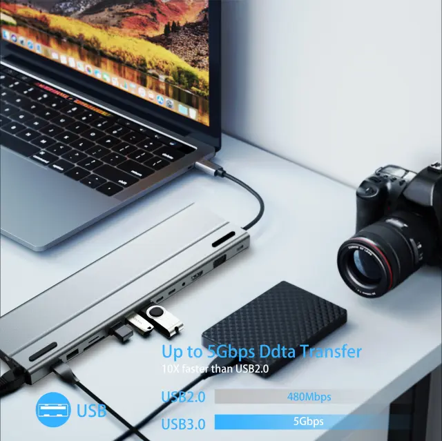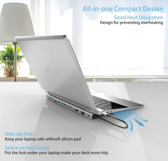 Obsežna združljivost: To 14-v-1 zvezdišče je zasnovano za vsestranskost in je združljivo s široko paleto naprav, vključno s prenosniki, tabličnimi računalniki in pametnimi telefoni z vrati USB-C. Njegova funkcija »plug-and-play« zagotavlja enostavno nastavitev brez potrebe po dodatnih gonilnikih ali programski opremi.