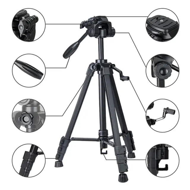 Vsestranska uporaba: Ta stativ je odlična izbira za različne potrebe fotografiranja in snemanja videoposnetkov. Zaradi združljivosti s fotoaparati in pametnimi telefoni je primeren za fotografiranje na prostem, pretakanje v živo, studijsko snemanje in drugo.