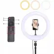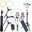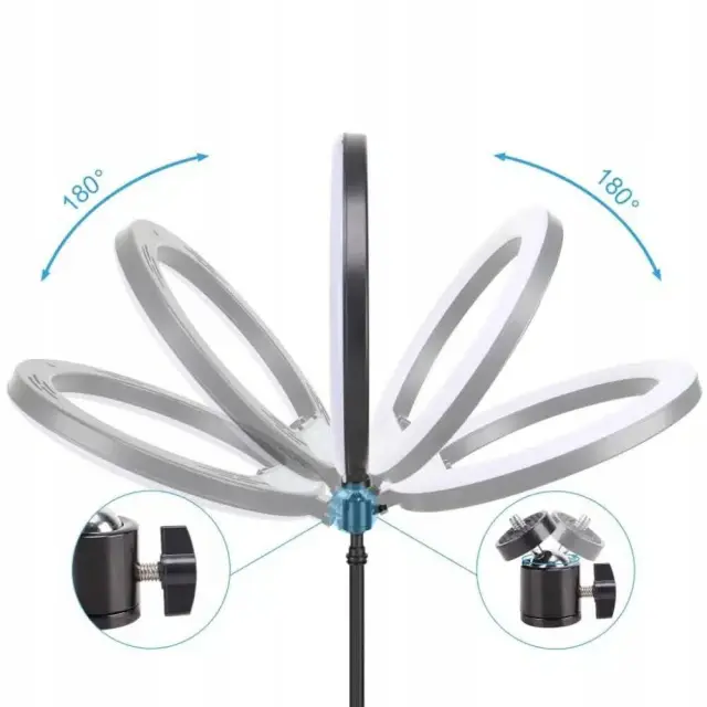 Na osrednjem mestu obročaste svetilke so mesta za do 3 držala za mobilne telefone. Imajo prilagodljiv podaljšek, ki vam omogoča, da svoj pametni telefon postavite pod več koti in snemate iz 3 naprav hkrati! To je zelo uporabno za ljudi, ki delajo selfije (npr. razkazovanje ličil), pa tudi za fotografiranje izdelkov in tihožitij, med snemanjem videovlogov in še veliko več!