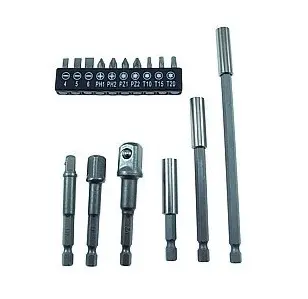 Vrste nastavkov: ploščati 4, 5, 6; phillips 1, 2, (križ), pozidriv 1, 2 in svetilke T10, T15, T20, 3 adapterji za nastavke različnih dolžin 1/4 inča in 3 adapterji za nasadne ključe 1/4, 3/8 in 1/2 palca .