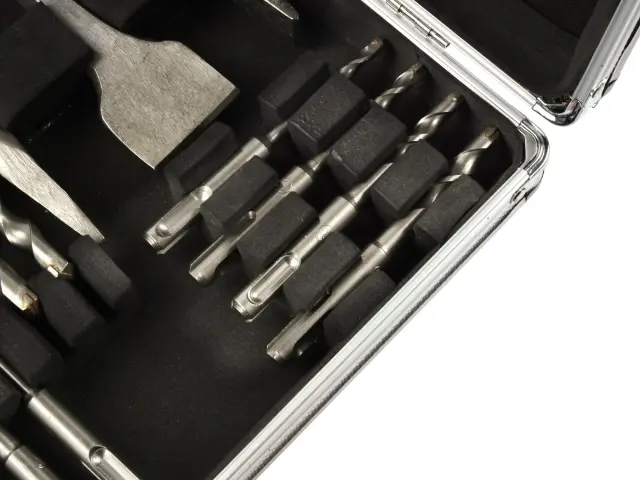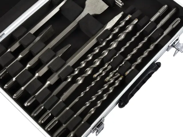 12 svedrov: 5×110, 6×110, 8×110, 10×110, 6×160, 8×160, 10×160, 12×160, 8×210, 10×210, 12×260, 14×260 mm 2 dleta: 140×20, 250×20 mm 3 ravna dleta: 250×20, 140×21, 250×40 mm Material: CR jeklo