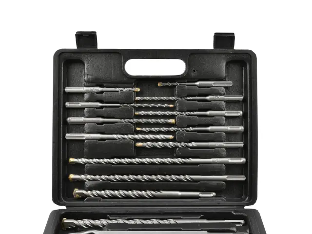 13 svedrov: 5,5×110, 6×110, 5×160, 5,5×160, 6×160, 6,5×160, 7×160, 8×160, 10×160, 14×210, 10×160, 12x udarno dleto: 250 mm 2 ploščata dleta: 250×20, 250×40 mm rezalnik brazd: 250 mm plastični kovček Material: CR jeklo