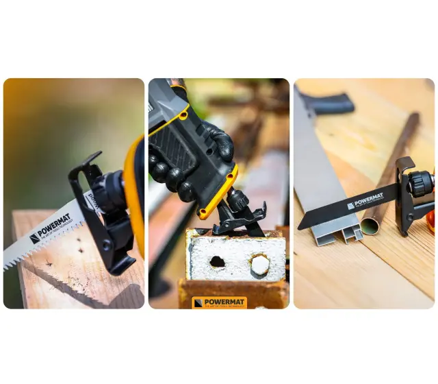 Udobna in lahka sabljasta žaga POWERMAT PM-PSZ-1800T za rezanje lesa, jekla, aluminija in plastike.