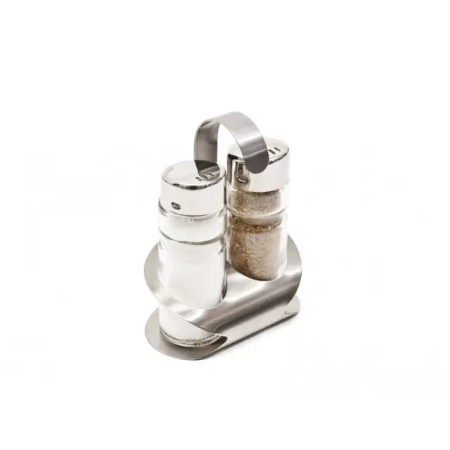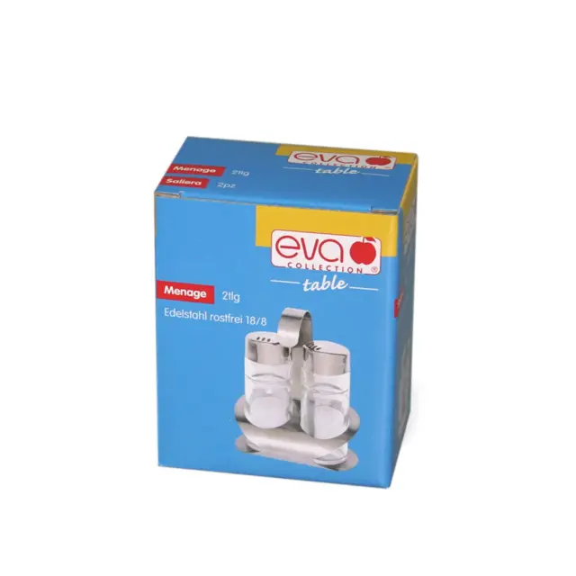 EVA 2-DELNI NAMIZNI SET Z DRŽALOM - SOLNICA je primeren za shranjevanje soli in popra. Izdelan je iz stekla in nerjavečega jekla 18/8 odpornega proti rji.