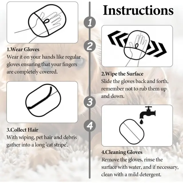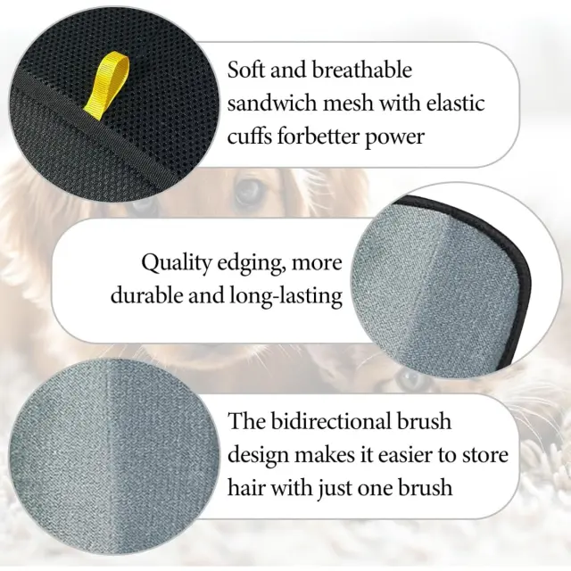 Učinkovito odstranjevanje dlak hišnih ljubljenčkov: Te dvostranske rokavice za odstranjevanje dlak hišnih ljubljenčkov ponujajo izjemno rešitev za učinkovito odstranjevanje dlak hišnih ljubljenčkov z različnih površin, vključno s pohištvom, oblačili, preprogami in notranjostjo avtomobilov. Edinstvena oblika omogoča hitro in enostavno pobiranje dlak s preprostim potegom v katero koli smer. Visoko gostotni bombažni material je posebej zasnovan tako, da privlači in ujame celo najbolj trdovratne dlake hišnih ljubljenčkov, kar zagotavlja čisto okolje brez dlak. Je bistveno orodje za lastnike hišnih ljubljenčkov, ki iščejo učinkovito in priročno rešitev za odstranjevanje dlak, ki jim pomaga ohranjati urejen in udoben bivalni prostor. Rokavice so enostavne za uporabo in lahko hitro spremenijo videz vsakega doma.