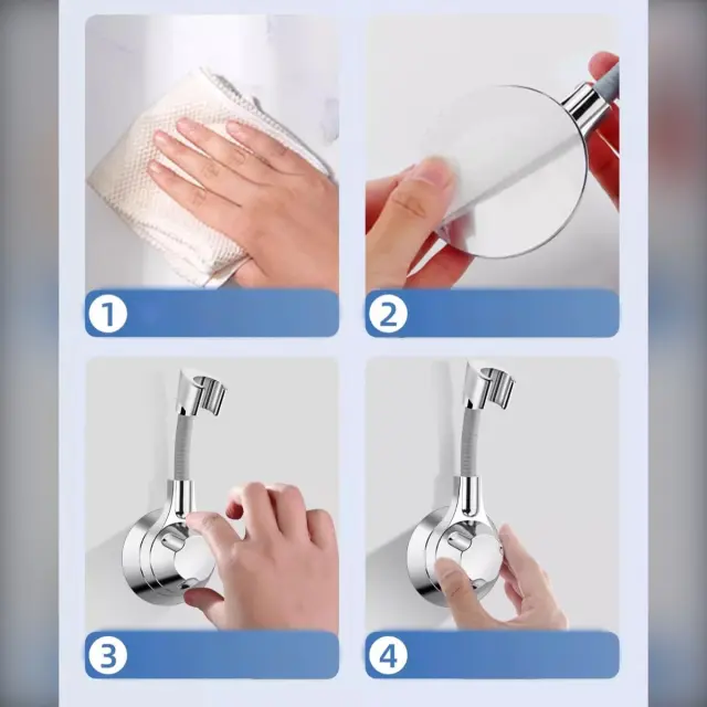 Enostavna montaža: Prosimo, upoštevajte: to niso originalni deli. Ta držalo za prho omogoča montažo brez vrtanja z močno sesalno in lepilno zasnovo, ki ščiti stene kopalnice pred poškodbami. Je idealno za najemnike ali za tiste, ki želijo hitro namestitev brez trajnih sprememb na ploščicah ali steklenih površinah. Namestitev je hitra in ne pušča ostankov, kar omogoča čisto in brezskrben uporabniški potek.