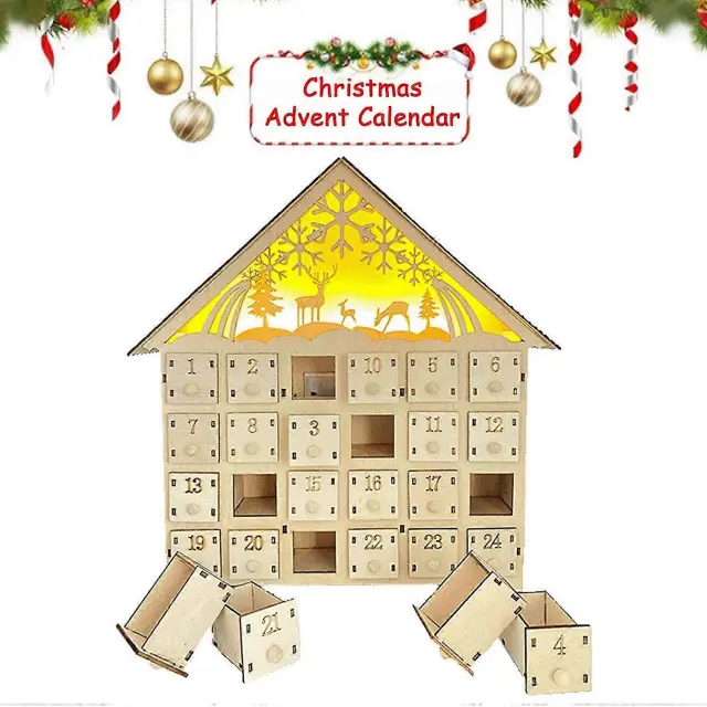 2022 božični LED leseni adventni koledar s 24 predali, 24-dnevno odštevanje sveti DIY adventni koledar prazna škatla božični praznični okraski