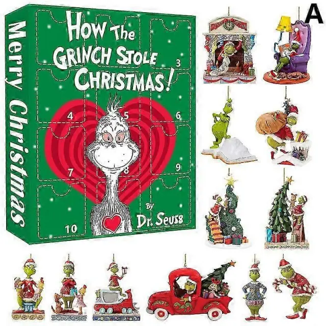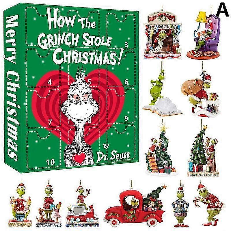 2025 Ustvarjalni božični adventni koledar, 12-urna slepa škatla Grinch, zelena kosmata pošast, obesek za božično drevo, okras