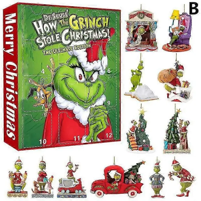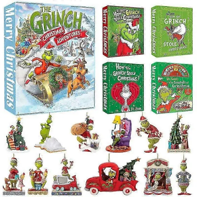 2025 Ustvarjalni božični adventni koledar, 12-urna slepa škatla Grinch, zelena kosmata pošast, obesek za božično drevo, okras