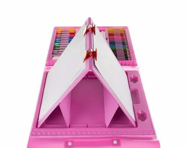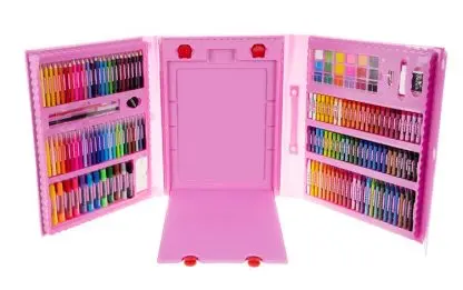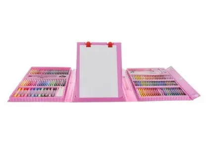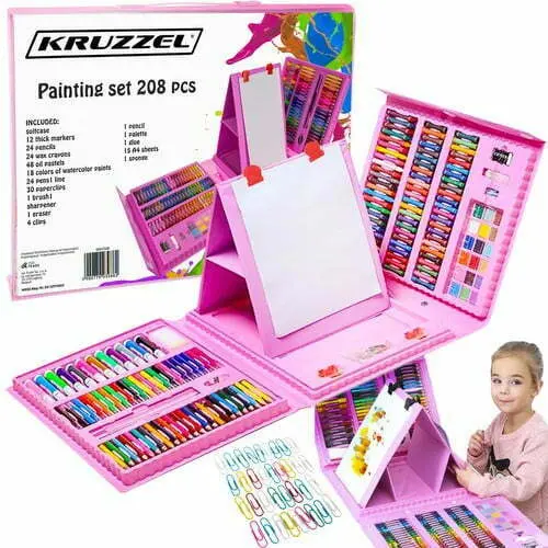 SET - set za slikanje v kovčku ima kar 208 elementov , med drugim: kovček 12 debelih markerjev, 24 svinčnikov, 24 voščenih barvic, 48 oljnih pastelov, 18 barv akvarelnih barv, 24 markerjev, 1 ravnilo, 30 sponk, 1 čopič, 1 šilček, radirka, 4 sponke, 1 svinčnik, 1 paleta, 1 lepilo, 15 A4 listov, 1 goba.