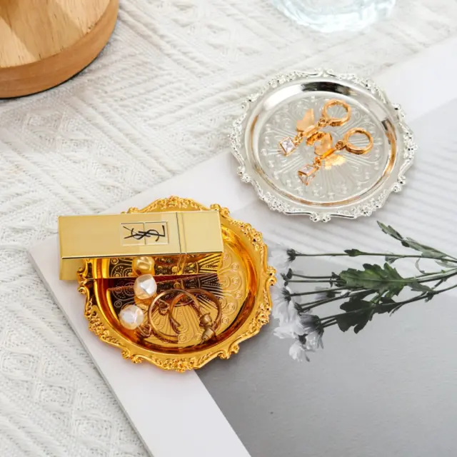 Elegantna Dekoracija Doma: Ta pladenj z evropskim reliefnim slogom izboljša vašo dekoracijo doma s svojim luksuznim in prefinjenim dizajnom. Srebrni vložek doda pridih elegance, zaradi česar je popoln za razstavljanje nakita, parfumov ali drugih dragocenosti. Uporabite ga za dvig estetike vsake sobe. Zapletene podrobnosti in prefinjena obdelava ga naredijo izrazit kos, idealen za mizice za kavo, toaletne mizice ali celo kot osrednji element za posebne priložnosti. Izdelan iz visokokakovostnega nerjavečega jekla, zagotavlja zanesljivo površino za razstavljanje vaših cenjenih stvari, hkrati pa dodaja pridih evropskega šarma.