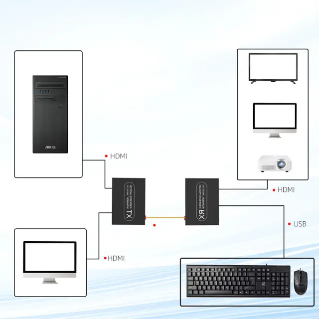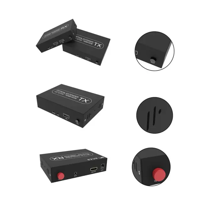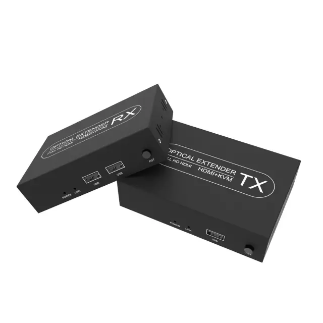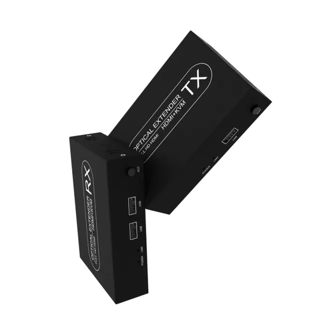 Prenos na dolge razdalje: ta podaljšek HDMI KVM podpira razdalje prenosa signala do 20 kilometrov prek enega samega optičnega kabla, zaradi česar je idealen za uporabo na velikih prizoriščih ali v napravah, kjer je potreben prenos signala na dolge razdalje.