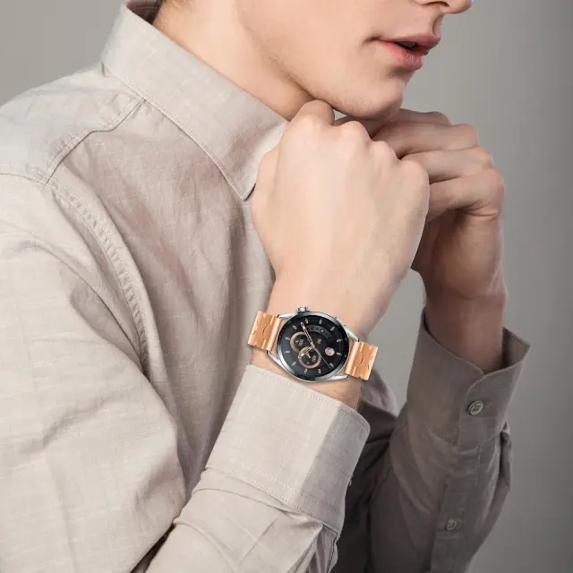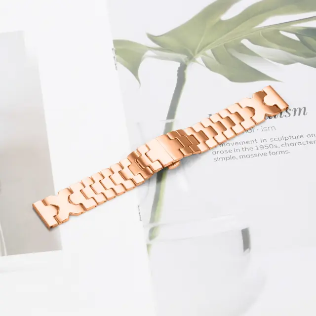 Eleganten zaključek v rožnatem zlatu: Zaključek zagotavlja prefinjen in eleganten videz, ki izboljšuje celotno estetiko vaše pametne ure. Ta elegantna barva dopolnjuje različne obleke in priložnosti, zaradi česar je vsestranski dodatek za sproščene in formalne priložnosti. Gladka, polirana površina zagotavlja udoben občutek na koži in preprečuje draženje tudi med dolgotrajno nošnjo. Njegov prefinjen videz doda pridih razkošja vaši zapestju in vas loči s subtilnim, a opaznim pridihom.