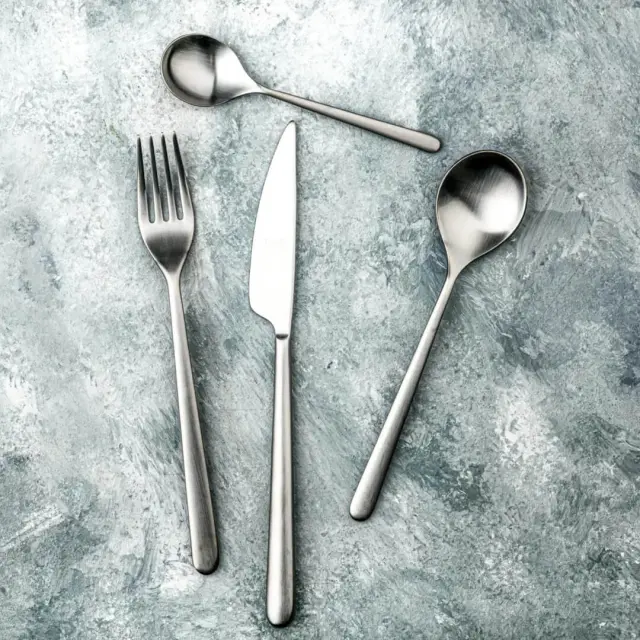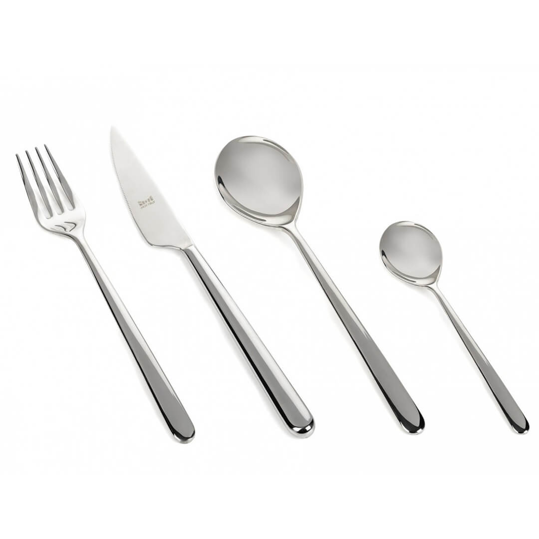 Luksuzni 24-delni jedilni pribor Linea združuje izvirnost žlic s preprostostjo ročajev in izžareva tako razkošje kot življenjski slog. Je del italijanske blagovne znamke Mepra, ki je kombinacija elegance in najvišje kakovosti. Njegov hladen, minimalističen, seksi slog se zgleduje po vplivnih oblikovalcih, kot je Angelo Mangiarotti, ki sledi tradiciji, tehniki in vrhunskim materialom. Set je izdelan iz kakovostnega nerjavečega jekla (RVS) 18/10. RVS je oblika visoko legiranega jekla, ki vsebuje več kot 5 % legirnih elementov, zato je jeklo je trdno in odporno proti oksidaciji ter koroziji (rji). Izraz 18/10 pomeni, da je zlitina sestavljena iz 18 % kroma in 10 % niklja, kar zagotavlja odlično kakovost, tudi pri pogosti uporabi in pomivanju v pomivalnem stroju. Set sestavlja 6 žlic (20 cm), 6 vilic (20,3 cm), 6 nožev (23,5 cm) in 6 kavnih žličk (13,7 cm). Primerno za 6 oseb. Ta čudovit komplet jedilnega pribora je popolna naložba in dopolnitev vsake mize.