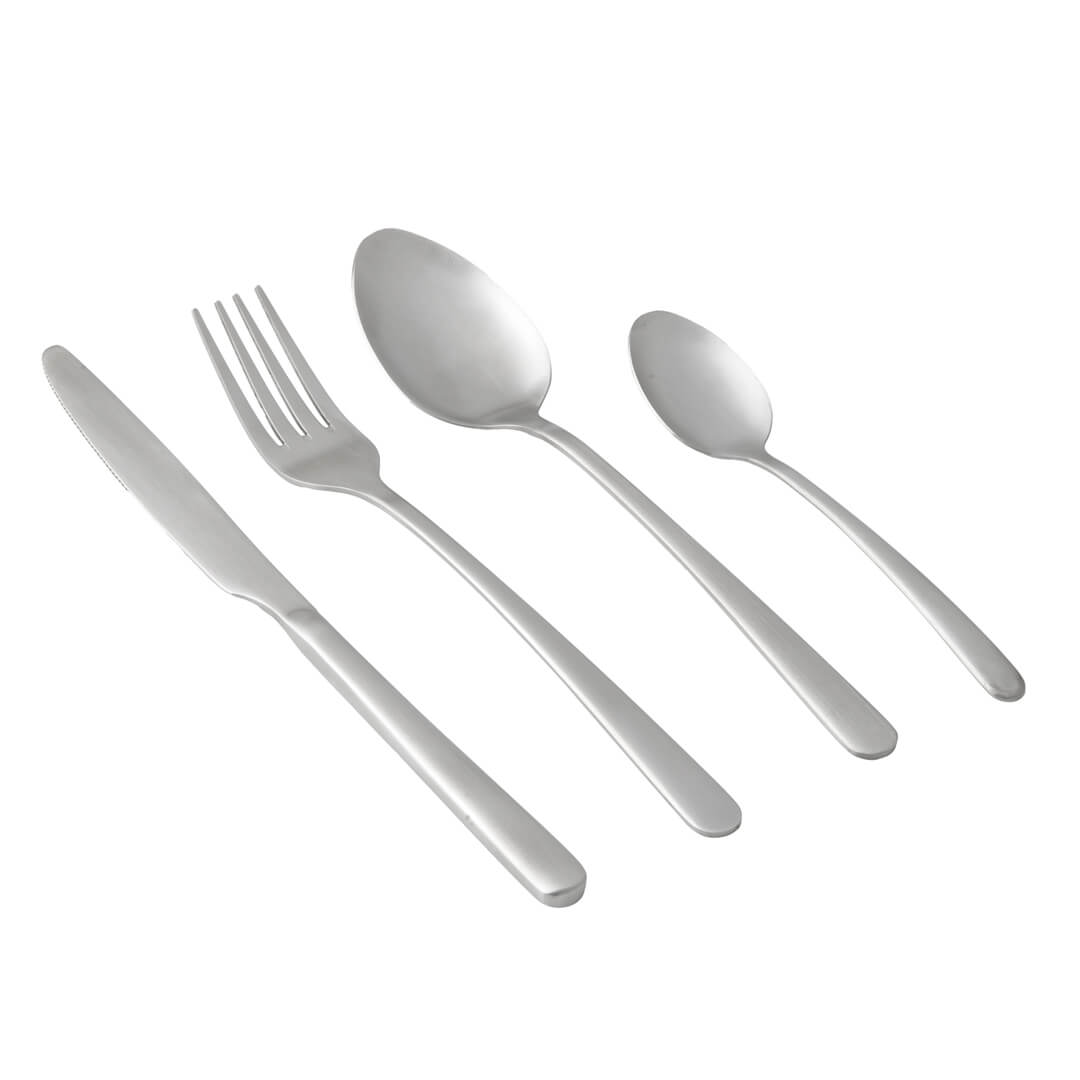 24-delni jedilni pribor je izdelan iz nerjavečega jekla s satenastim zaključkom, ki združuje prefinjen in sodoben videz, hkrati pa zmanjša vidnost prstnih odtisov in prask, kar zagotavlja dolgotrajno brezhiben videz. Idealen je tako za vsakodnevno uporabo kot tudi za posebne priložnosti. Elegantne linije in ergonomska oblika zagotavljajo udoben oprijem, zaradi česar je vsak obrok prijetna izkušnja. Komplet vključuje 6 vilic, 6 nožev, 6 žlic in 6 čajnih žličk. Primerno za pomivanje v pomivalnem stroju.