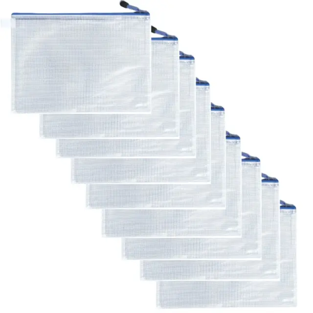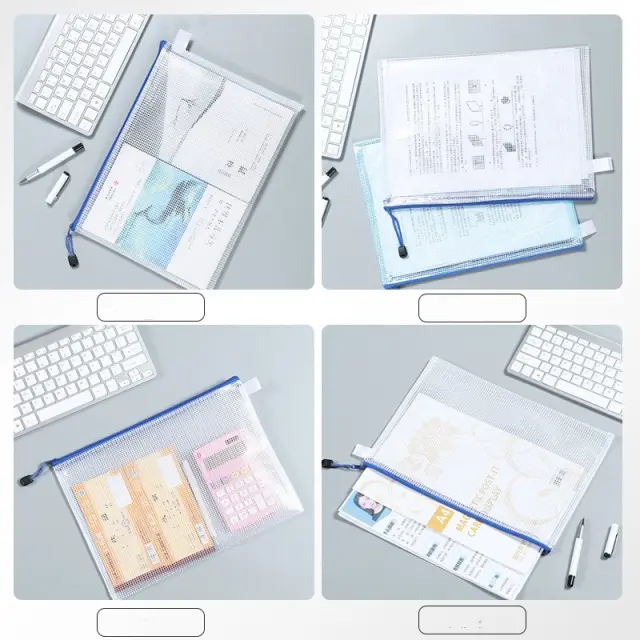 Komplet plastičnih vrečk A4 in A5 z zadrgo za shranjevanje papirjev in zapiskov, pa tudi za razvrščanje in organiziranje drugih predmetov. Vrečke z zadrgo so izdelane iz trpežnega PVC-ja in ščitijo pred obrabo in umazanijo.