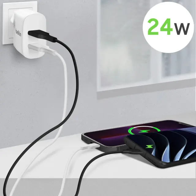 Vaš stenski polnilnik je opremljen z dvojnimi vrati USB, vključno s kablom Apple Lightning. Izkoristite znanje in izkušnje kalifornijske blagovne znamke Belkin, specializirane za visokotehnološke vrhunske izdelke. Izkoristite popolno združljivost za vaš iPhone in/ali iPad, opremljen s priključkom Lightning. Ta 2 USB priključka omogočata hkratno polnjenje dveh naprav.