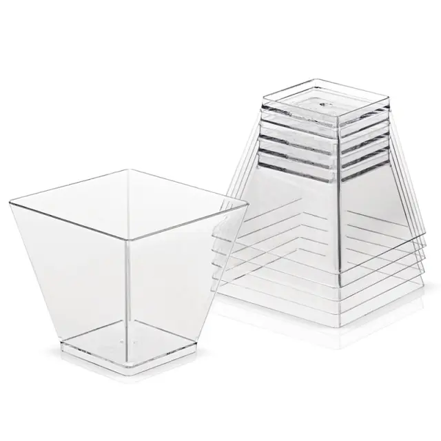 Kristalna jasnost: Ti desertni lončki so izdelani iz visoko prozorne PS plastike, ki omogoča optimalno vidljivost vaših slastnih kreacij. Z lahkoto pokažite žive barve in zapletene plasti svojih sladic.