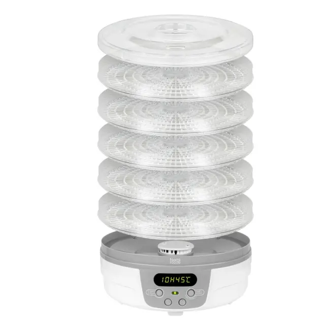 Sušilnik se ponaša z večstopenjskimi pladnji, ki omogočajo hkratno sušenje večjih količin različnih vrst hrane, kar je izjemno praktično za shranjevanje sezonskih pridelkov. S svojim elegantnim in kompaktnim dizajnom se brez težav prilega vsaki kuhinji, medtem ko tiho delovanje omogoča, da ga uporabljate kadarkoli brez motenj. Zlahka nastavljive nastavitve temperature in časa sušenja omogočajo, da prilagodite postopek sušenja specifičnim potrebam posameznih živil. Poleg tega, je LCD zaslon pregleden in enostaven za uporabo, kar vam olajša spremljanje in nadzor nad procesom sušenja.