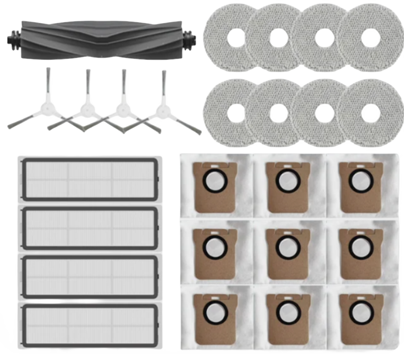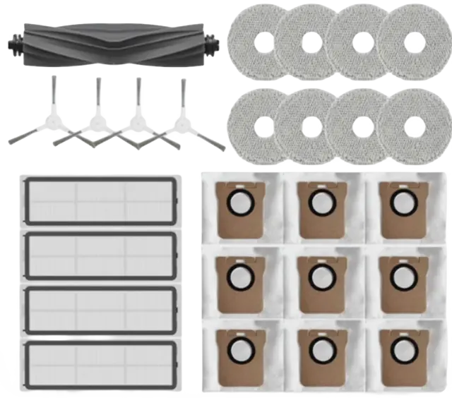 Krtače in filtri, združljivi z Dreame: Set rezervnih delov vključuje 1 glavno krtačo, 4 stranske krtače, 8 blazinic za brisanje, 4 filtre za sesalnik in 9 vrečk za sesalnik, združljive z Dreame L10s Ultra/S10 Pro, Xiaomi Mijia Omni Robot Vacuum-Mop B101CN in Xiaomi Robot Vacuum X10 Plus.