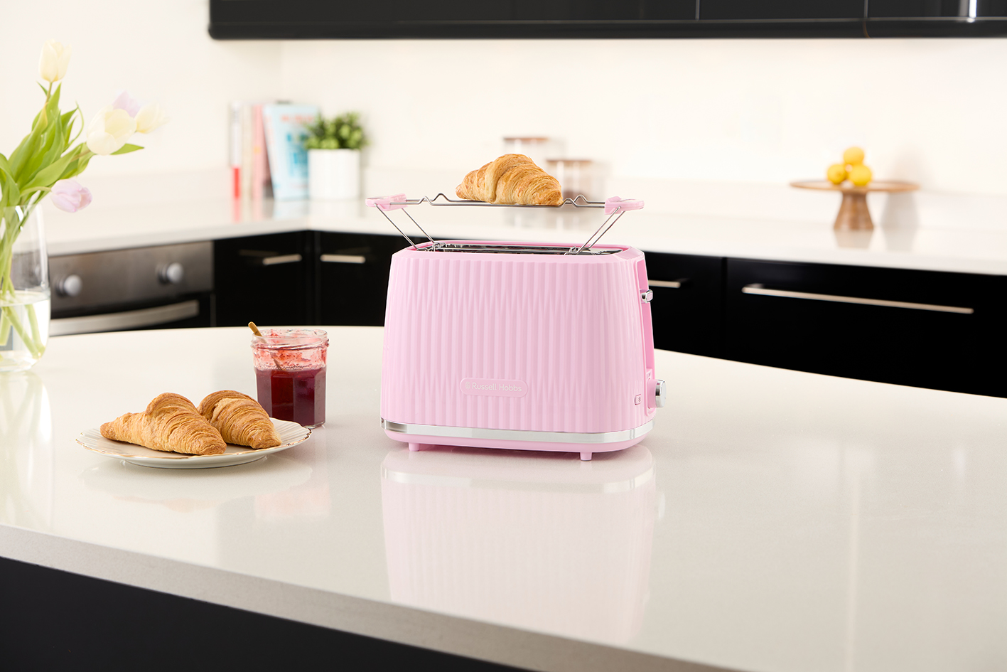 Vaše jutro se bo začelo odlično s toasterjem Russell Hobbs Eden v modni barvi roza maline, ki je zasnovan tako, da izstopa in popolno popeka vse vrste kruha. Privlačna teksturirana zunanjost je izstopajoč element na vsakem kuhinjskem pultu. S šestimi nastavitvami porjavitve, grelnikom žemljic ter funkcijami zamrzovanja, ponovnega segrevanja in preklica pa ima vse potrebno, da popečete rezino natanko tako, kot jo imate radi. S funkcijo visokega dviga lahko toast ali žemljo enostavno dvignete iz reže za segrevanje in jo preprosto vzamete.