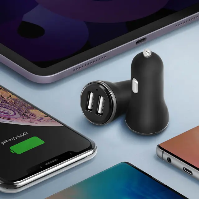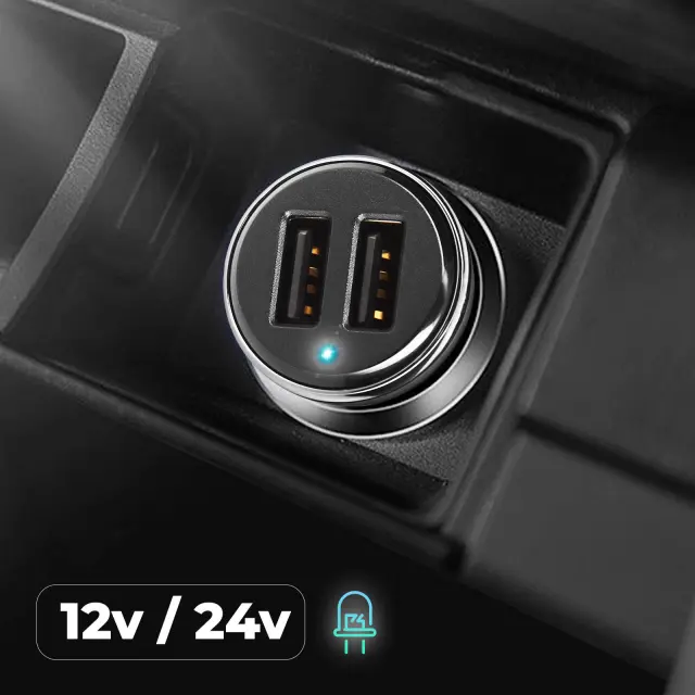 Polnilec za cigaretni vžigalnik 2,4 A z dvema USB vhodoma, ki lahko hkrati polnita dve napravi. Visoka amperaža za hitro polnjenje vaših pametnih telefonov in/ali tablic med potovanjem z avtomobilom.