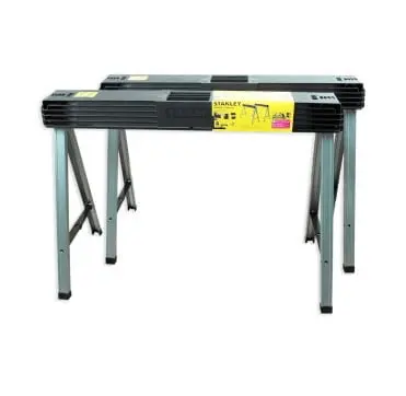 Zložljiva kovinska stolica (par) STANLEY® zagotavlja hitro in priročno začasno delovno mizo za rezanje materialov ali priročno ravno površino za delo za obremenitve do 340 kg. Ta močan in stabilen konjiček za žago je mogoče v nekaj sekundah zložiti za shranjevanje, ga pritrditi skupaj in prenašati kot par z uporabo integriranih nosilnih ročajev ali odstranljivega ramenskega traku za enostaven transport na delovišče in z njega.