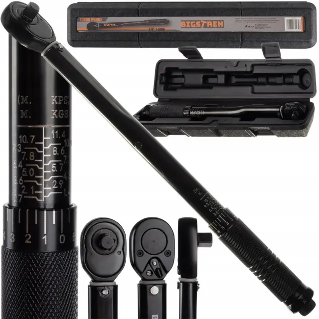 SPECIFIKACIJA – material: jeklo; desna / leva tipka; zaskočna glava; najmanjši navor: 7 (Nm); največji navor: 112 (Nm); za privijanje in odvijanje vijačnih zvez: da; univerzalno: da, za kvadratne vijake, šestrobe vijake, kljuke, matice za motocikle itd.; dinamometer: da; priloženo: ključ in etui; širina: 3 cm; mere: (nastavitev dolžine): 34,5- 37cm; teža ključa: 1,075 kg;