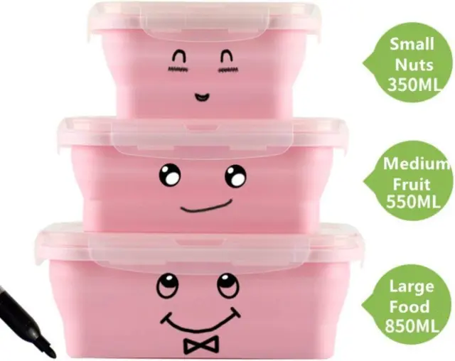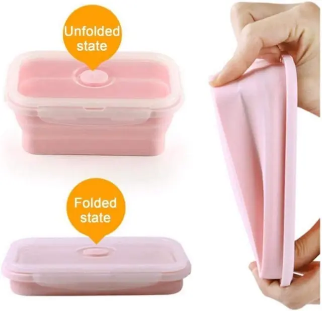 Široka uporaba: Zložljiva silikonska škatla za malico je popolna za shranjevanje hrane v zaprtih prostorih, kot je dom, bar, restavracija; tudi za dejavnosti na prostem, kot so služba, šola, piknik, podjetje, kampiranje, pohodništvo, potovanje in več. Primerno za mikrovalovno pečico, pečico, zamrzovalnik in pomivalni stroj. Prenosna zložljiva škatla za malico, dovolj lahka, da jo lahko vzamete kamor koli. Različne velikosti: 3 velikosti za vaše potrebe: majhna: 350 ml (otroški oreščki in sladkarije), srednja: 550 ml (sadje, torta, juha), velika: 850 ml (sendvič, solata, hrana za moške).