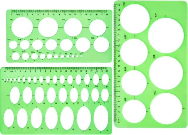 Specifikacije: Ta ravnila so na voljo v različnih velikostih, s skupno dolžino od 20 cm do 25 cm in širino od 10 cm do 14 cm.Predloge krogov in elips: z različnimi velikostmi krogov in elips lahko preprosto in priročno narišete kroge in valje.