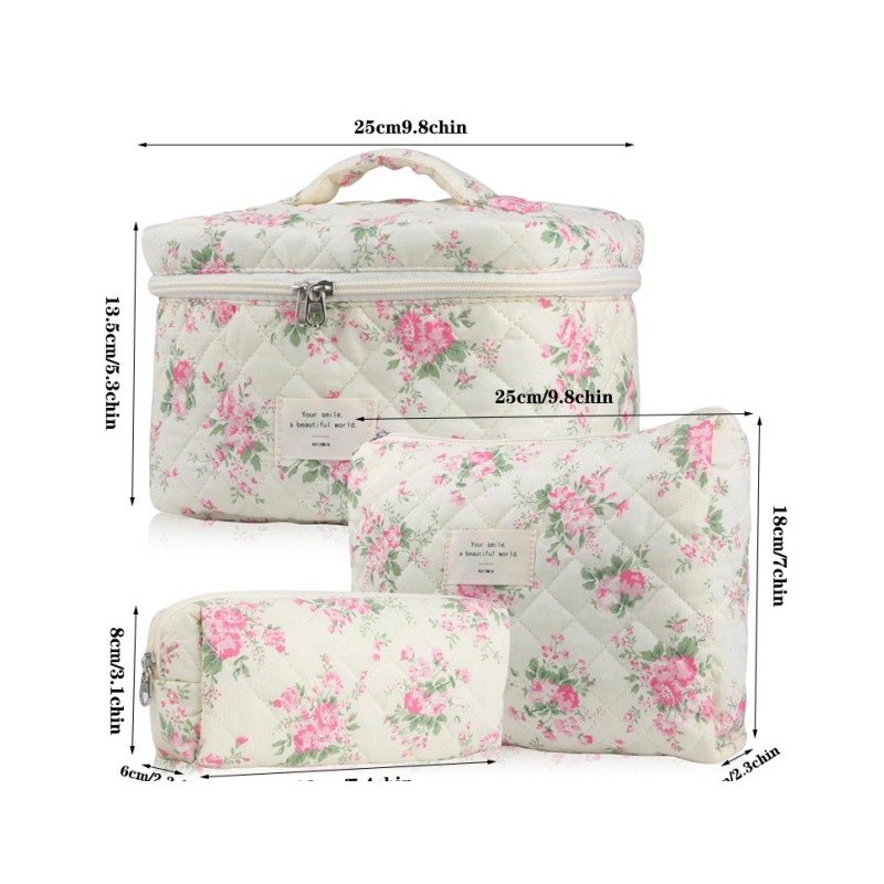 Organizirana rešitev za potovanja: Ta 3-delni komplet prenosnih kozmetičnih torbic zagotavlja organizirano rešitev za vse vaše potrebe po toaletnih pripomočkih na potovanjih. Komplet vključuje majhno, srednjo in veliko torbico, ki vam omogočajo ločevanje in kategorizacijo vaše kozmetike, izdelkov za nego kože in drugih pripomočkov. Cvetlični prešiti dizajn doda pridih elegance, medtem ko lahek material zagotavlja, da vas ne bo obtežil. Popoln za vikend pobeg, službena potovanja ali daljše počitnice, ta komplet ohranja vaše predmete varne in lahko dostopne. Razširljiva zasnova omogoča dodatno shranjevanje, ko je to potrebno, zaradi česar je vsestranski spremljevalec na potovanjih. Ročni dizajn omogoča enostavno prenašanje.