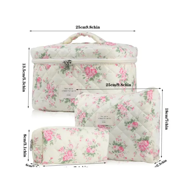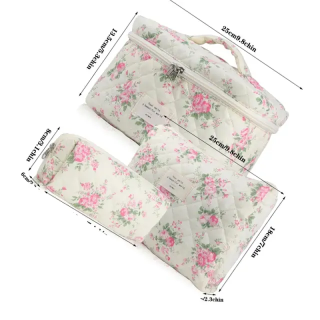 Velika kapaciteta shranjevanja: Velika kapaciteta teh kozmetičnih torbic zagotavlja, da lahko prenašate vso svojo kozmetiko in toaletne pripomočke, ne da bi pri tem ogrozili prostor. Prostorna notranjost vsake torbice sprejme različne velikosti steklenic, čopičev in palet. Prešita konstrukcija zagotavlja dodatno zaščito za vaše občutljive predmete. Idealen za vizažiste, ljubitelje lepote ali vse, ki morajo prenašati veliko količino kozmetike, ta komplet ponuja veliko prostora za shranjevanje in organizacijo. Cvetlični potisk doda eleganten pridih, zaradi česar je moden in funkcionalen dodatek. Ročni dizajn omogoča enostavno prenašanje.